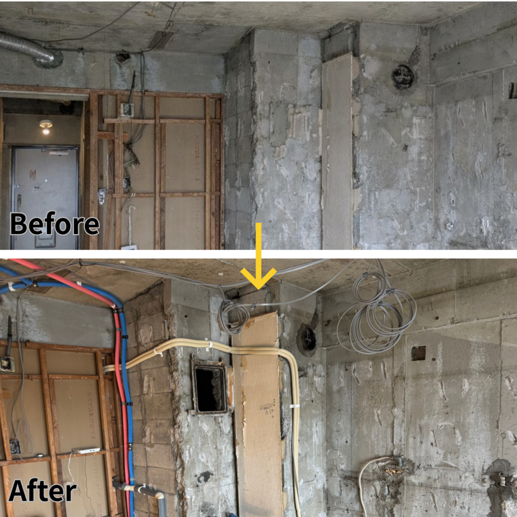 リノベーション工事に伴い、電気配線や設備配管の新設を行いました。天井や壁面に電気配線を施工し、照明・コンセントなどの電源を確保しています。 また、設備用の配管…